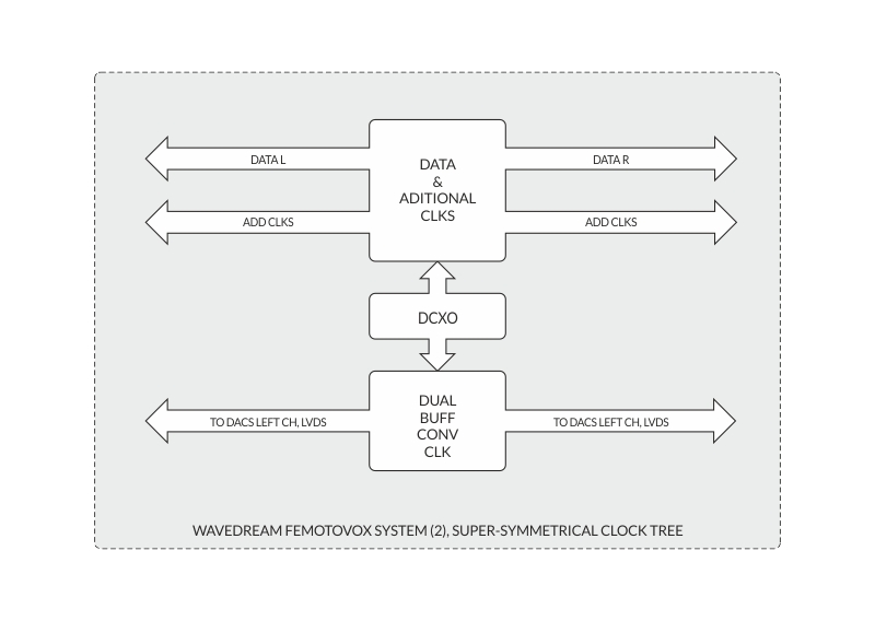 With these facts in mind, we designed for the Wavedream an advanced clock system called the femtovox. With femtovox in place, one is assured that only extremely small amounts of jitter are present at the dac conversion clock input. It’s unique architecture employs that conversion clock is directly synthesised at the dac input, without any conditioning, giving constant jitter performance at any sample rate. The conversion clock is controlled with 1 ppb precision, while exhibiting about 300 fS of jitter. The smallest jitter figure in the world? No. The smallest jitter figure where actually matters? Probably.