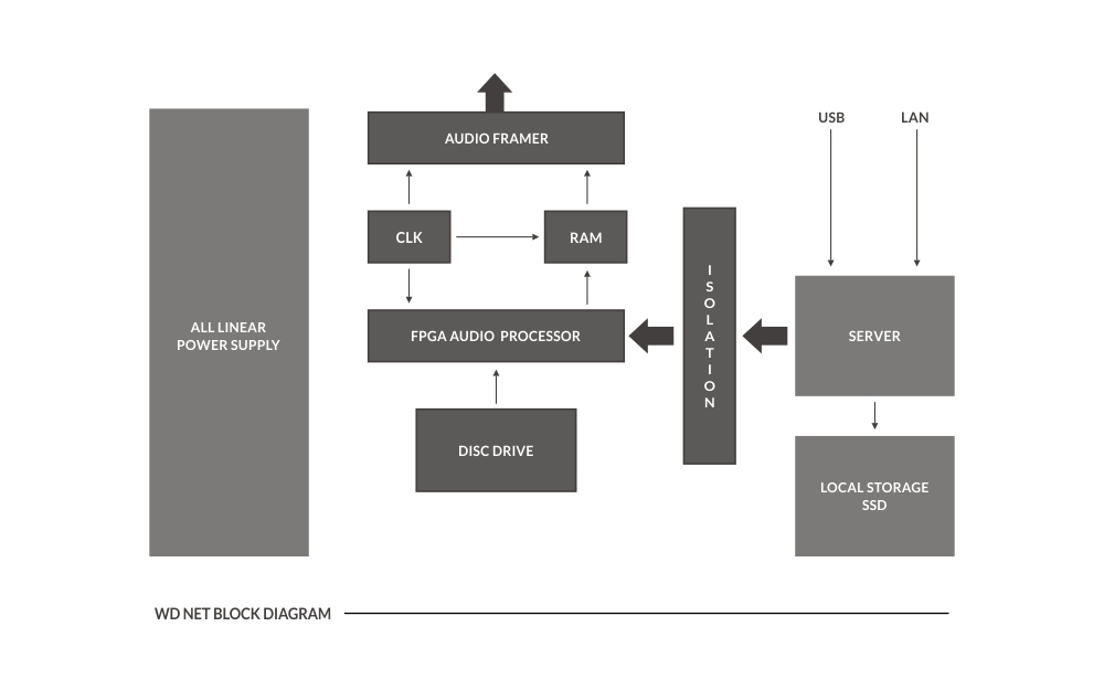 The NET is built around a powerful digital audio core, which streams all audio data into a large RAM buffer. The audio data is clocked out after a ultra-low phase noise masterclock, making the machine close to a ideal source. The powerful FPGA engine takes care in exclusive mode of the disc playback, which is totally separated by the server side. Also, the FPGA contain a large number of DSP units which can be very effective in real-time processing of audio streams, saving lots of processing power from the server’s side CPU.